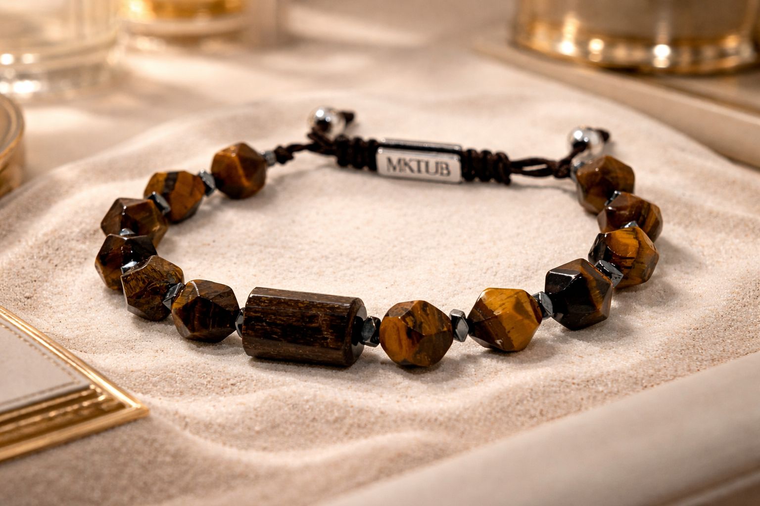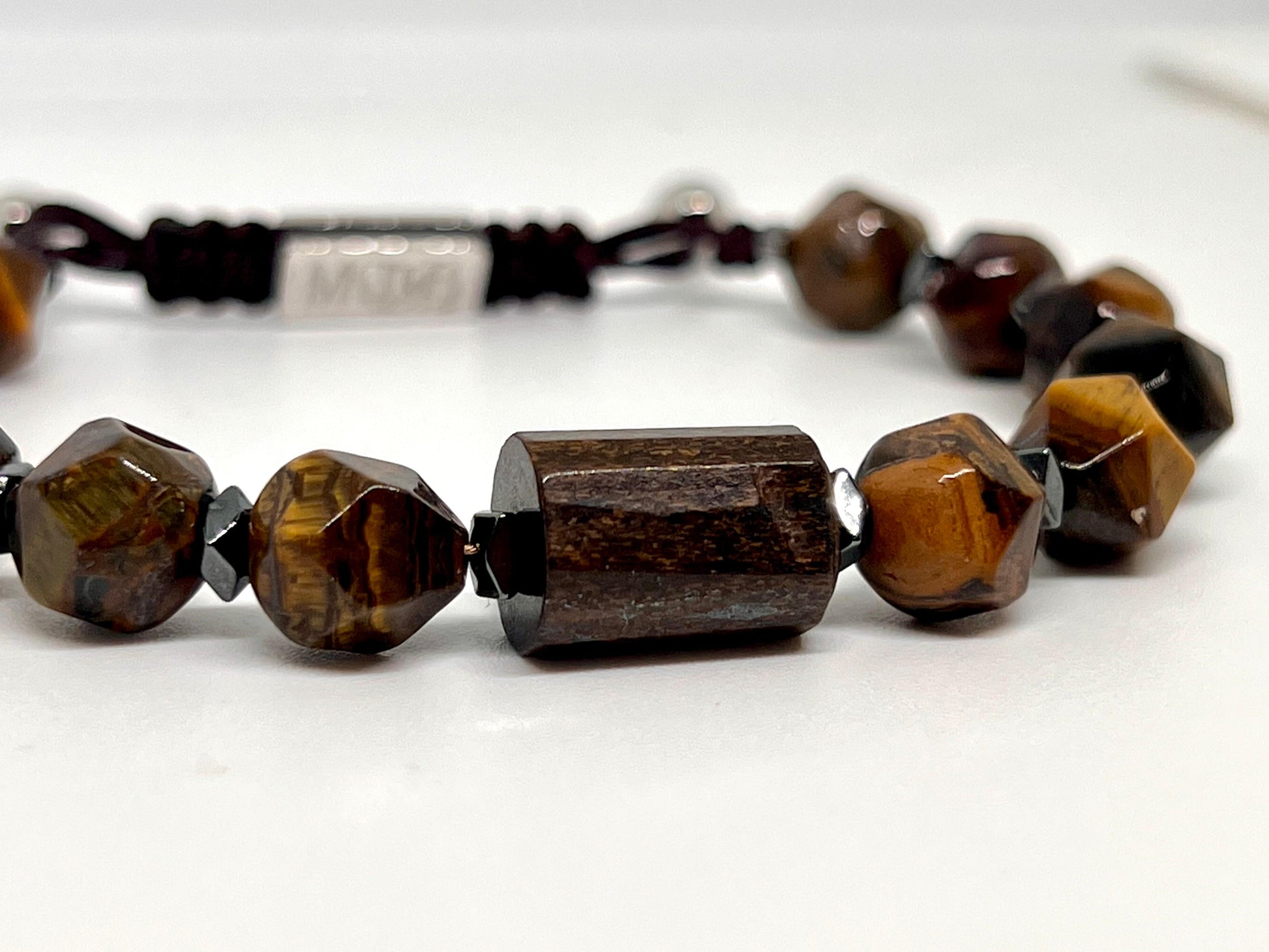 Una pieza que encarna fuerza y conexión con lo esencial. Compuesta por ojo de tigre en corte hexagonal, proyecta carácter, seguridad y dirección; al centro, un dije de broncita aporta estabilidad y una energía firme, casi magnética.