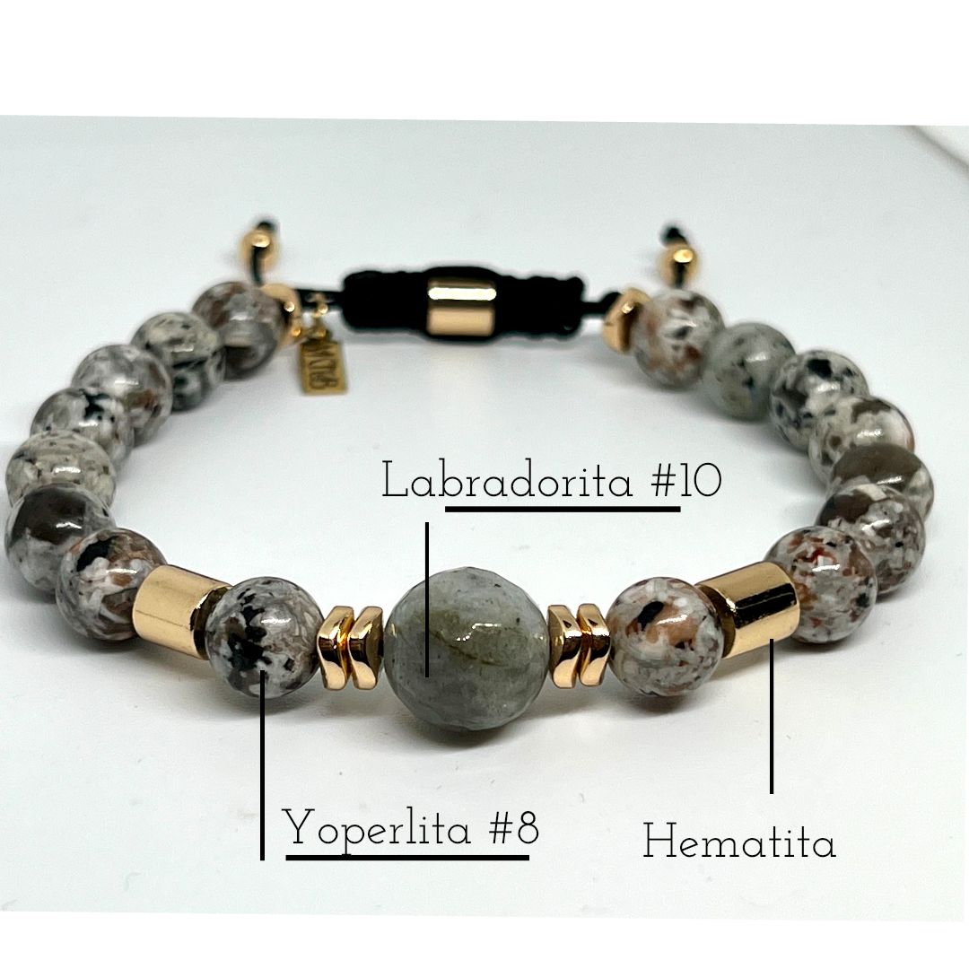 Aurum "Oro" en latín, sobrio y refinando , esta pieza minimalista une la fuerza de la piedra labradorita al centro con el resplandor sutil de la hematita dorada. Diseñada en conjunto con piedras yoperlital, la pulsera fluye en una composición armoniosa que celebra la belleza de lo esencial.