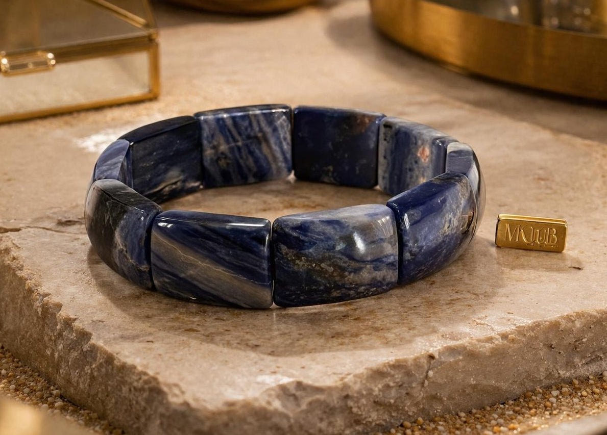 Brazalete de sodalita con vetas en tonos índigo y azul profundo, atravesadas por sutiles líneas blancas que hacen cada pieza única.