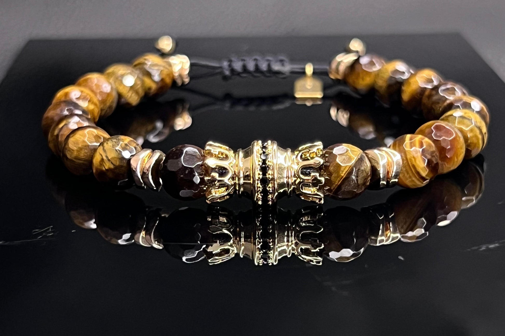 Este brazalete de ojo de tigre es perfecto para quien desea agregar un toque de elegancia a su estilo. Con una corona en tono dorado en el centro, refleja la fuerza y el poder del emperador. Ideal para cualquier ocasión formal o casual. ¡Consigue el tuyo hoy mismo!
